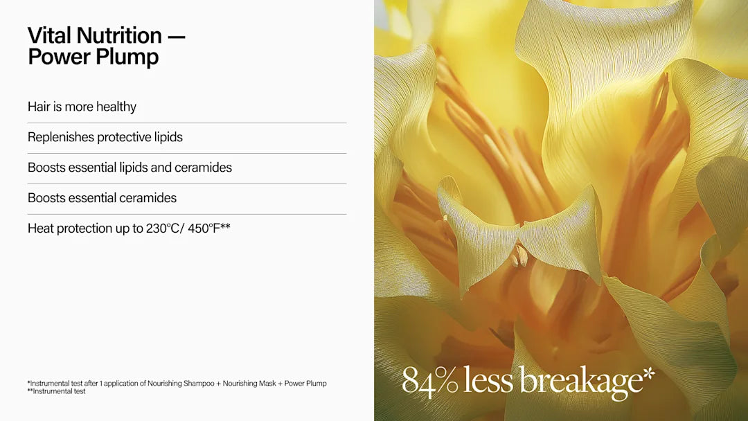 Plump up hair with Vital Nutrition Power Plump super concentrated gel-cream, a nourishing leave-in treatment designed to fill gaps in the hair fibre, lock in moisture, and smooth the cuticle. Perfect for dry, damaged, or chemically treated hair, this advanced formula evens out porosity, making hair more resilient, manageable and visibly healthier